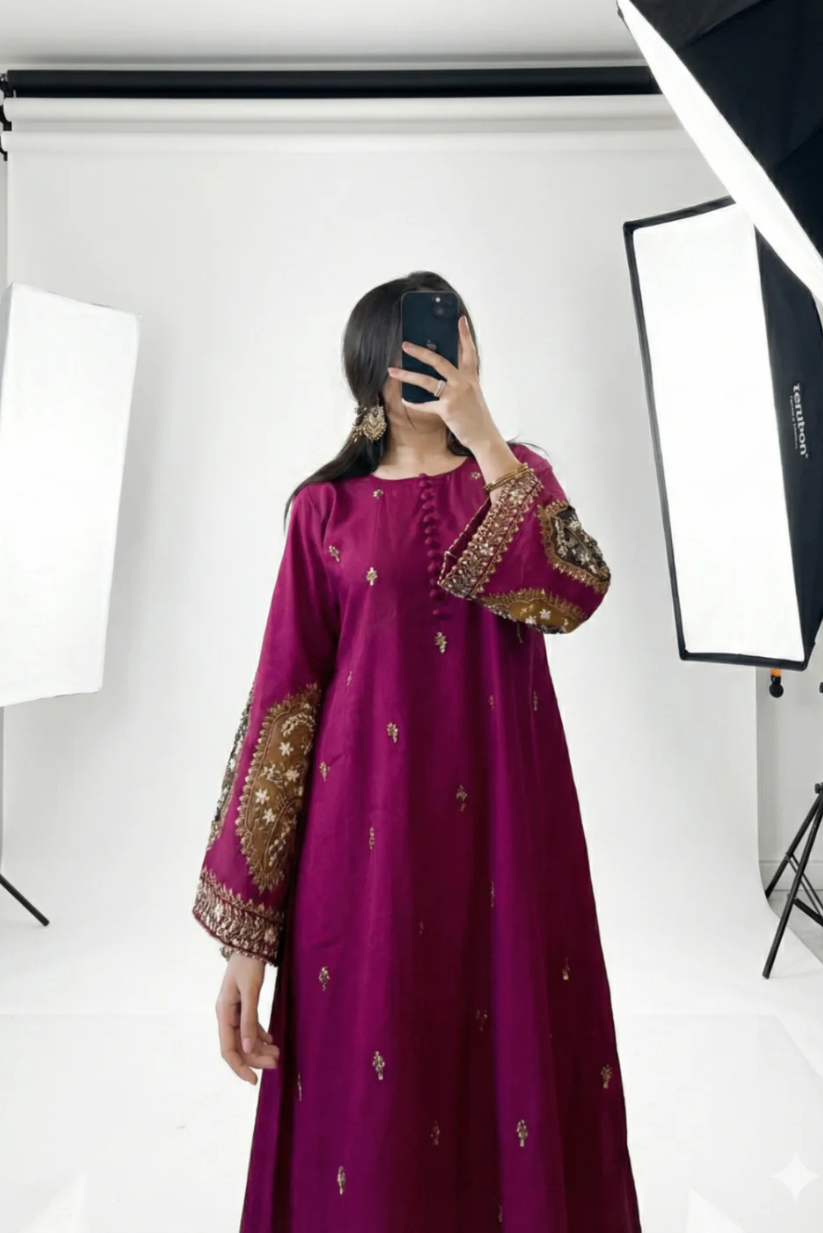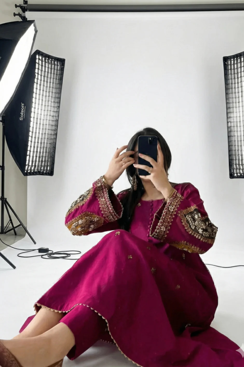 This exquisite Daily/Basic Wear Pishwas set in hot pink linen is a winter staple. The loose fit flared top features stunning stone work, while the straight trouser bottoms offer comfort and style. Complete with lining attached, this 2-piece ensemble exudes elegance effortlessly. Product ID: CBK0675 Brand name: Rosyribbons